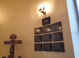 На момент нашего посещения, в храме уже находилась небольшая табличка – она была размещена неподалёку от креста и смотрелась композиция, прямо говоря, не лучшим образом. Надписи мелкие, практически не читаемые, да и сам мрамор, даже находясь в закрытом помещении, потускнел и утратил презентабельный вид.